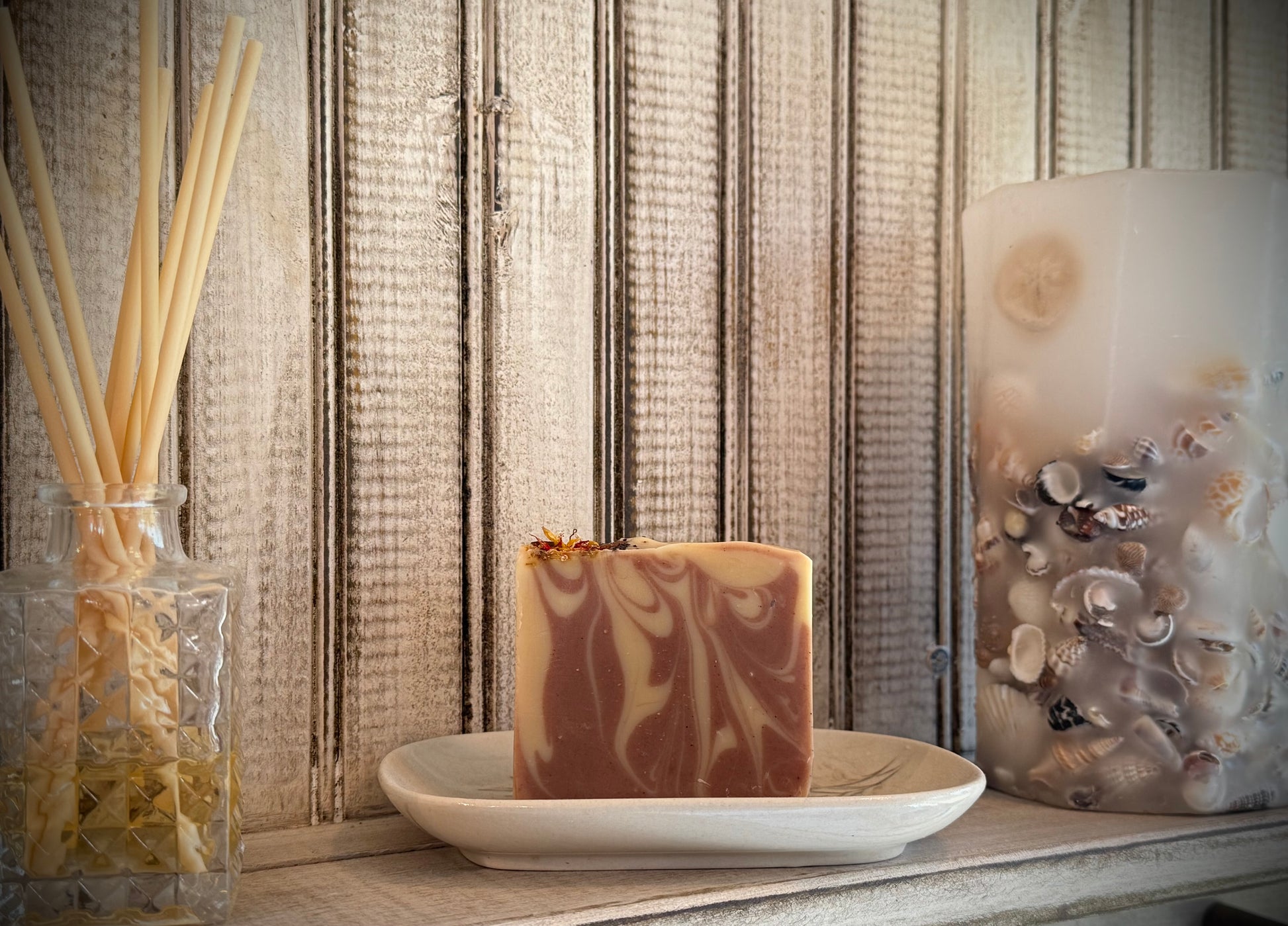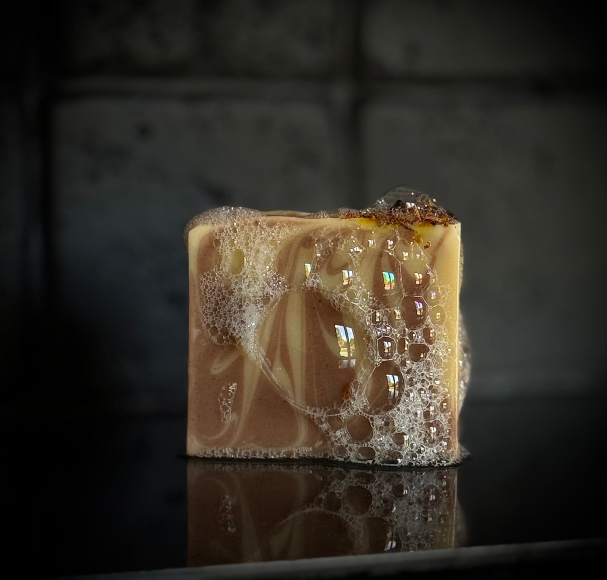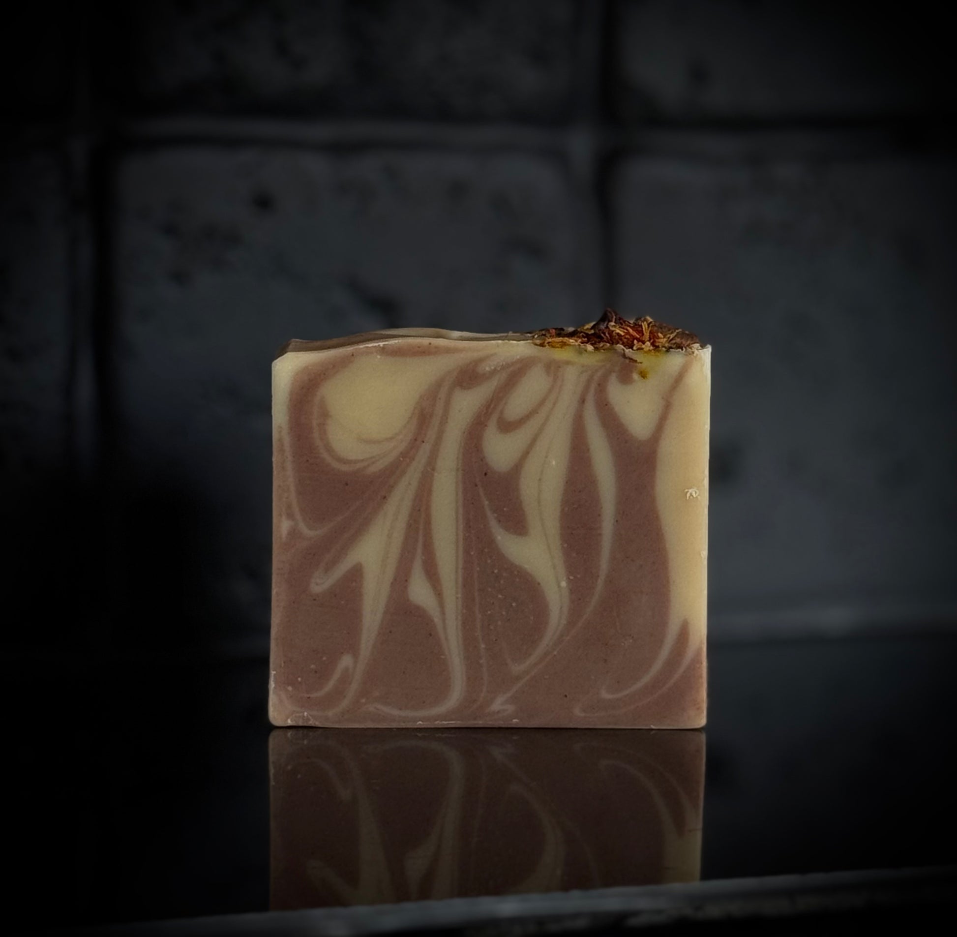 INGREDIENTS: Olive Oil, Coconut Oil, Cocoa Butter, Castor Oil, Brewed Coffee, Cocoa Powder, Kaolin Clay, Sugar, Sea Salt, Safflower Petals, Calendula Petals, Essential Oil Blend