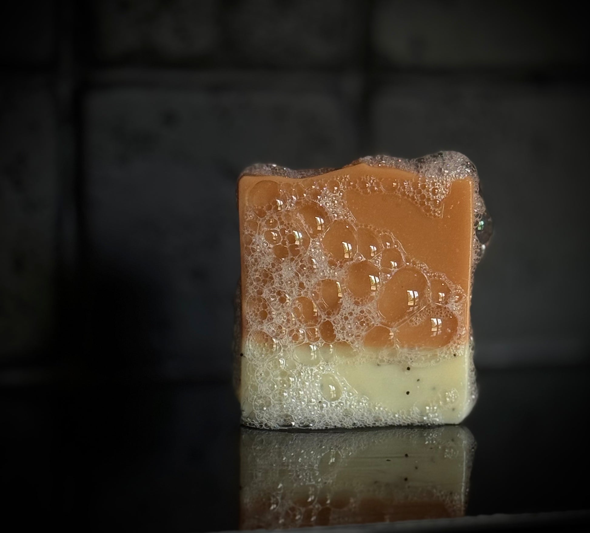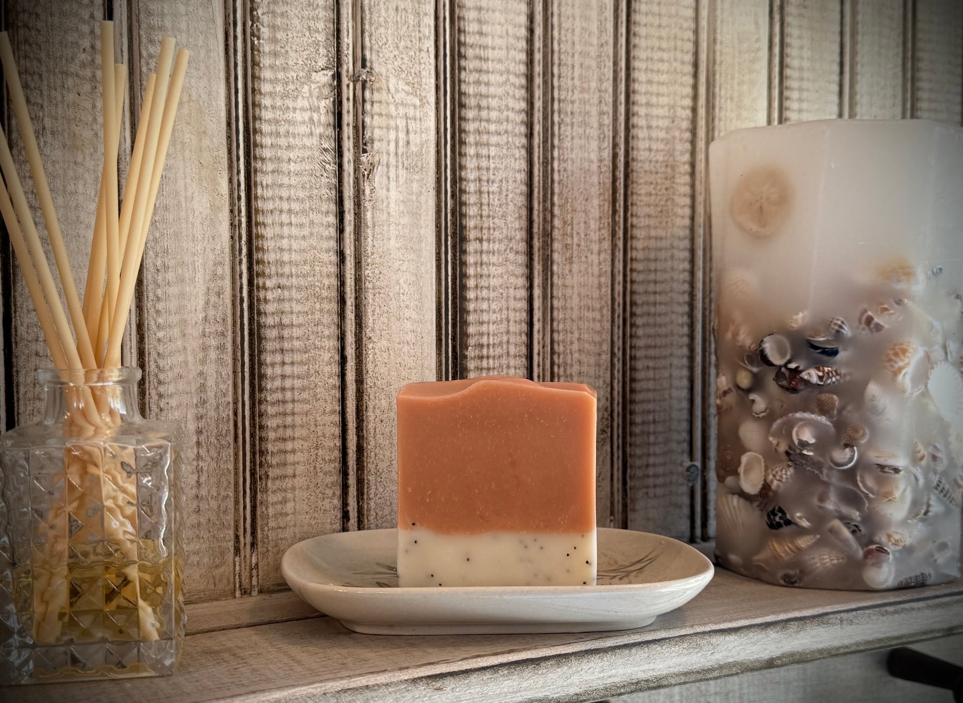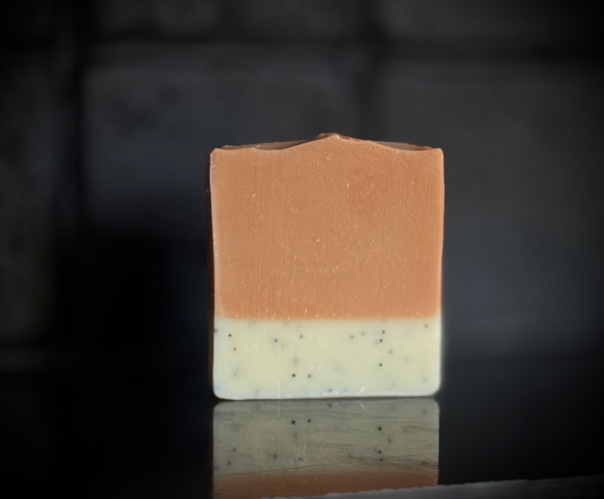 This soap features a bright orange and white design, with poppy seeds in the white for light exfoliation. The color comes from a combination carrots and orange clay, and it has a fresh citrus scent that will make you feel like you're in a citrus grove. Perfect for an energizing, refreshing clean.